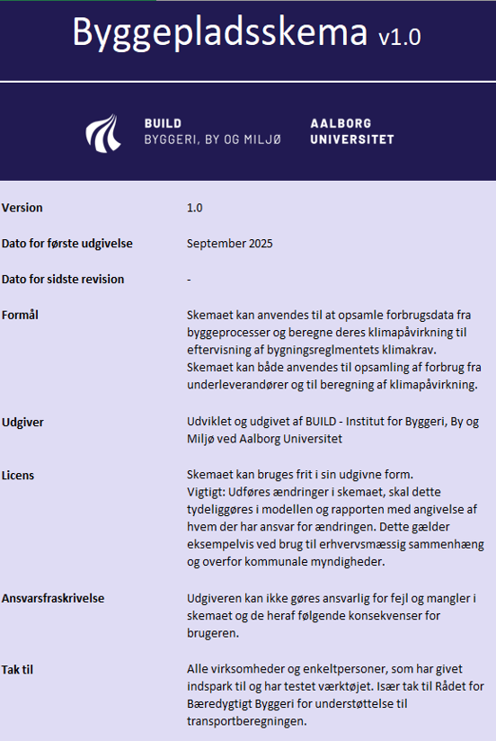 Byggepladsskemaet er et Excelværktøj til opgørelse af forbrug og klimaberegning af byggeprocesser, som kan anvendes til overholdelse af bygningsreglementets klimakrav.