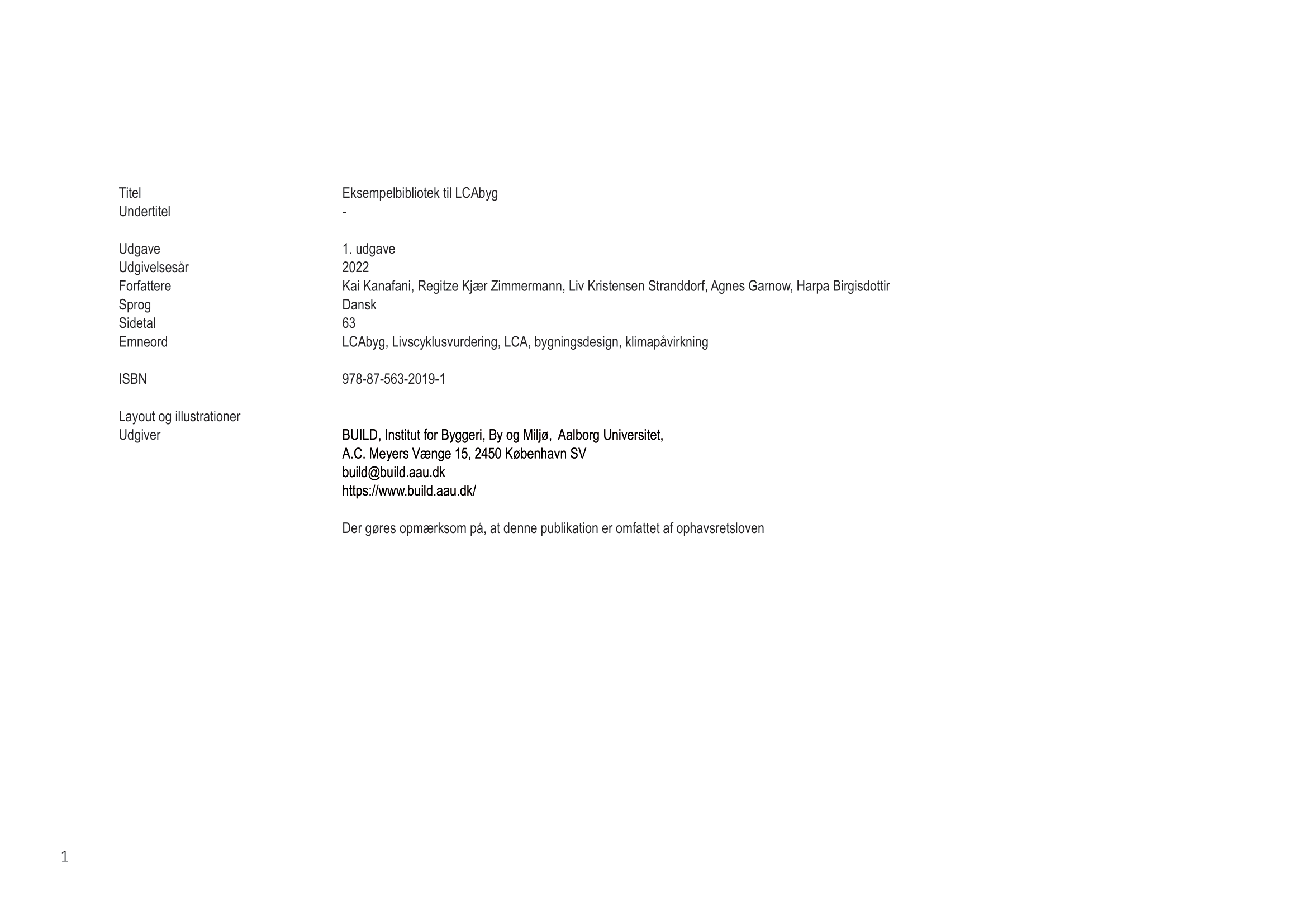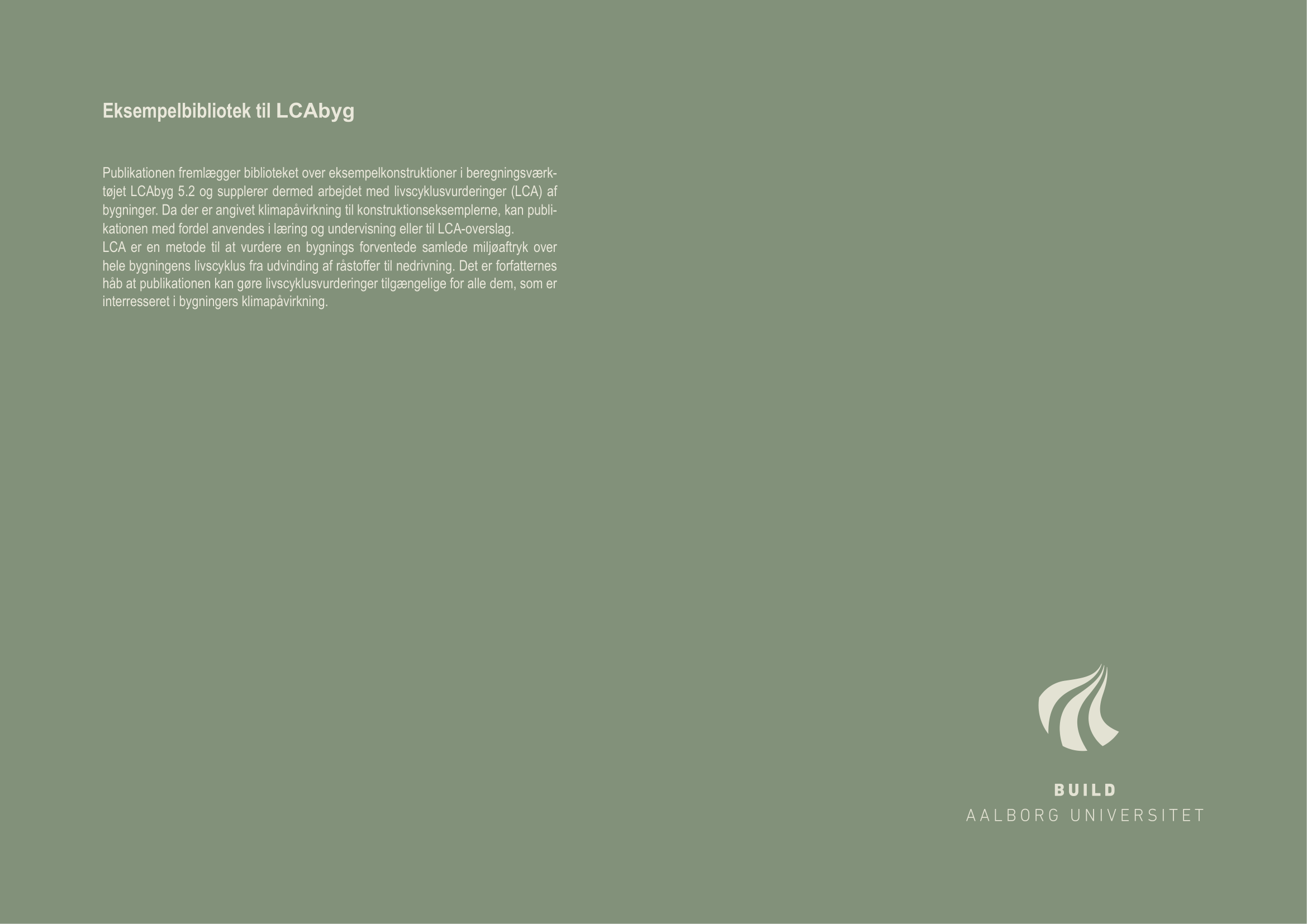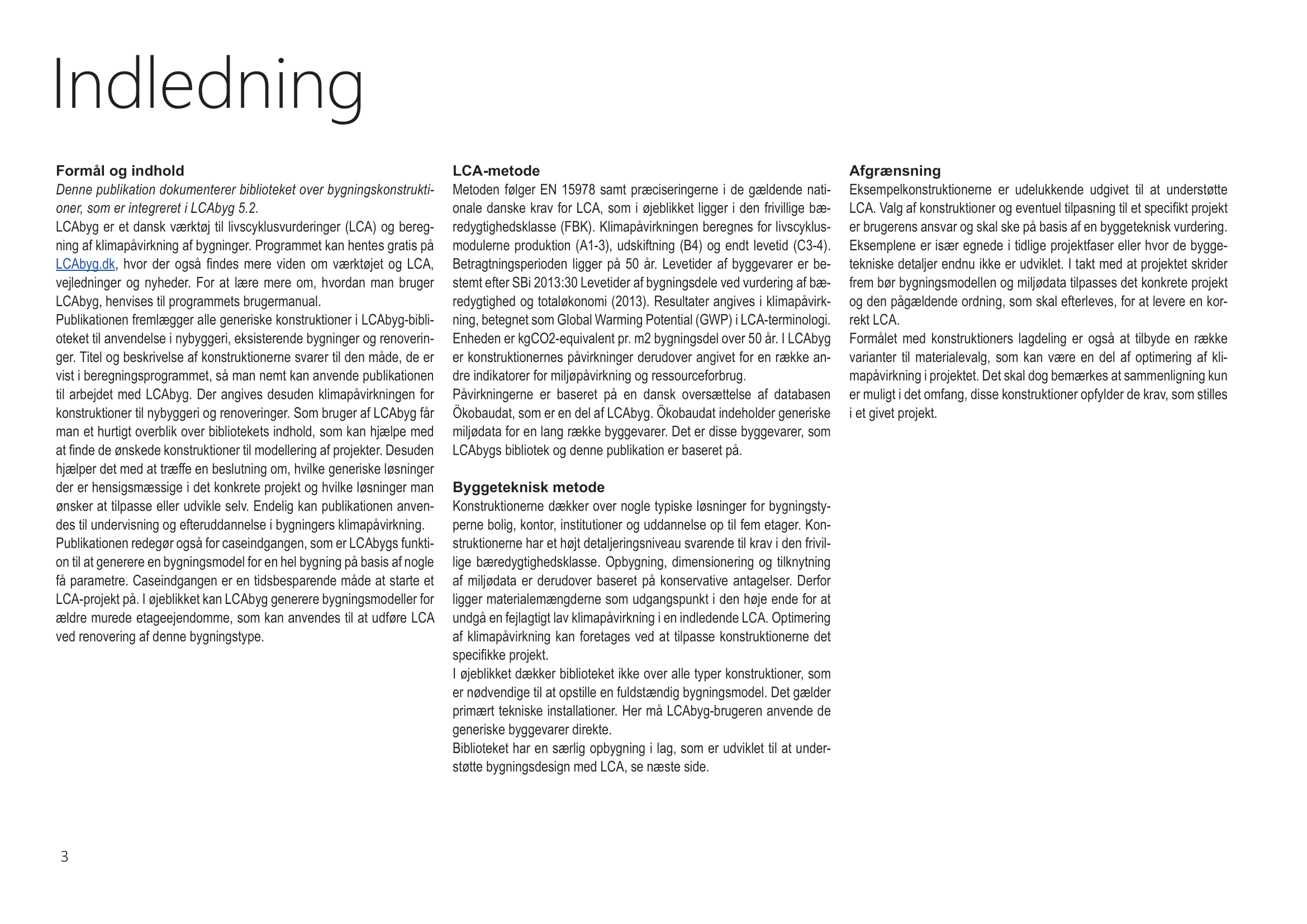 Publikationen fremlægger alle generiske konstruktioner i LCAbyg-biblioteket til anvendelse i nybyggeri, eksisterende bygninger og renoveringer. Titel og beskrivelse af konstruktionerne svarer til den måde, de er vist i beregningsprogrammet, så man nemt kan anvende publikationen til arbejdet med LCAbyg. Der angives desuden klimapåvirkningen for konstruktioner til nybyggeri og renoveringer. Som bruger af LCAbyg får man et hurtigt overblik over bibliotekets indhold, som kan hjælpe med at finde de ønskede konstruktioner til modellering af projekter. Desuden hjælper det med at træffe en beslutning om, hvilke generiske løsninger der er hensigsmæssige i det konkrete projekt og hvilke løsninger man ønsker at tilpasse eller udvikle selv. Endelig kan publikationen anvendes til undervisning og efteruddannelse i bygningers klimapåvirkning. Publikationen redegør også for caseindgangen, som er LCAbygs funktion til at generere en bygningsmodel for en hel bygning på basis af nogle få parametre. Caseindgangen er en tidsbesparende måde at starte et LCA-projekt på. I øjeblikket kan LCAbyg generere bygningsmodeller for ældre murede etageejendomme, som kan anvendes til at udføre LCA ved renovering af denne bygningstype.