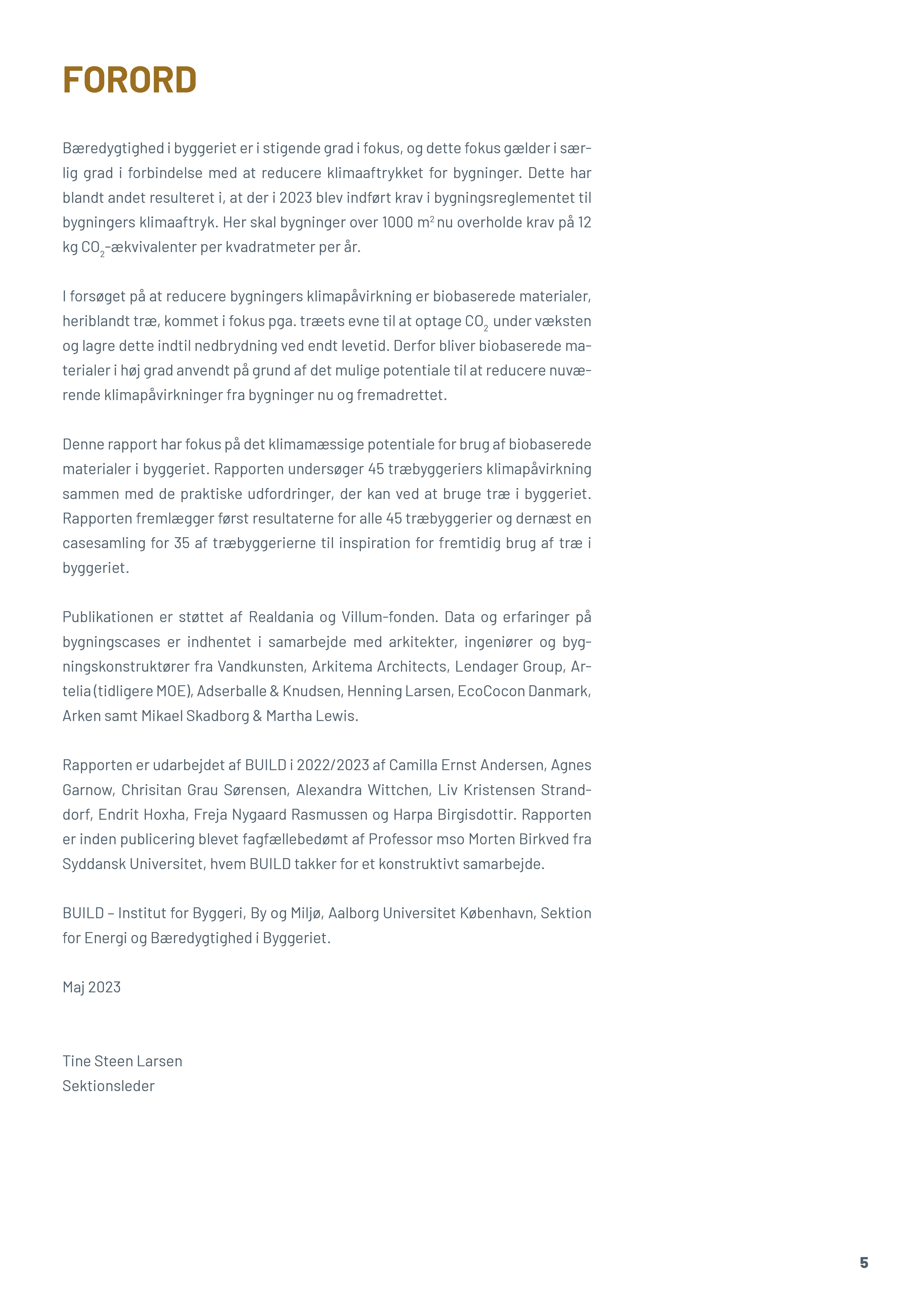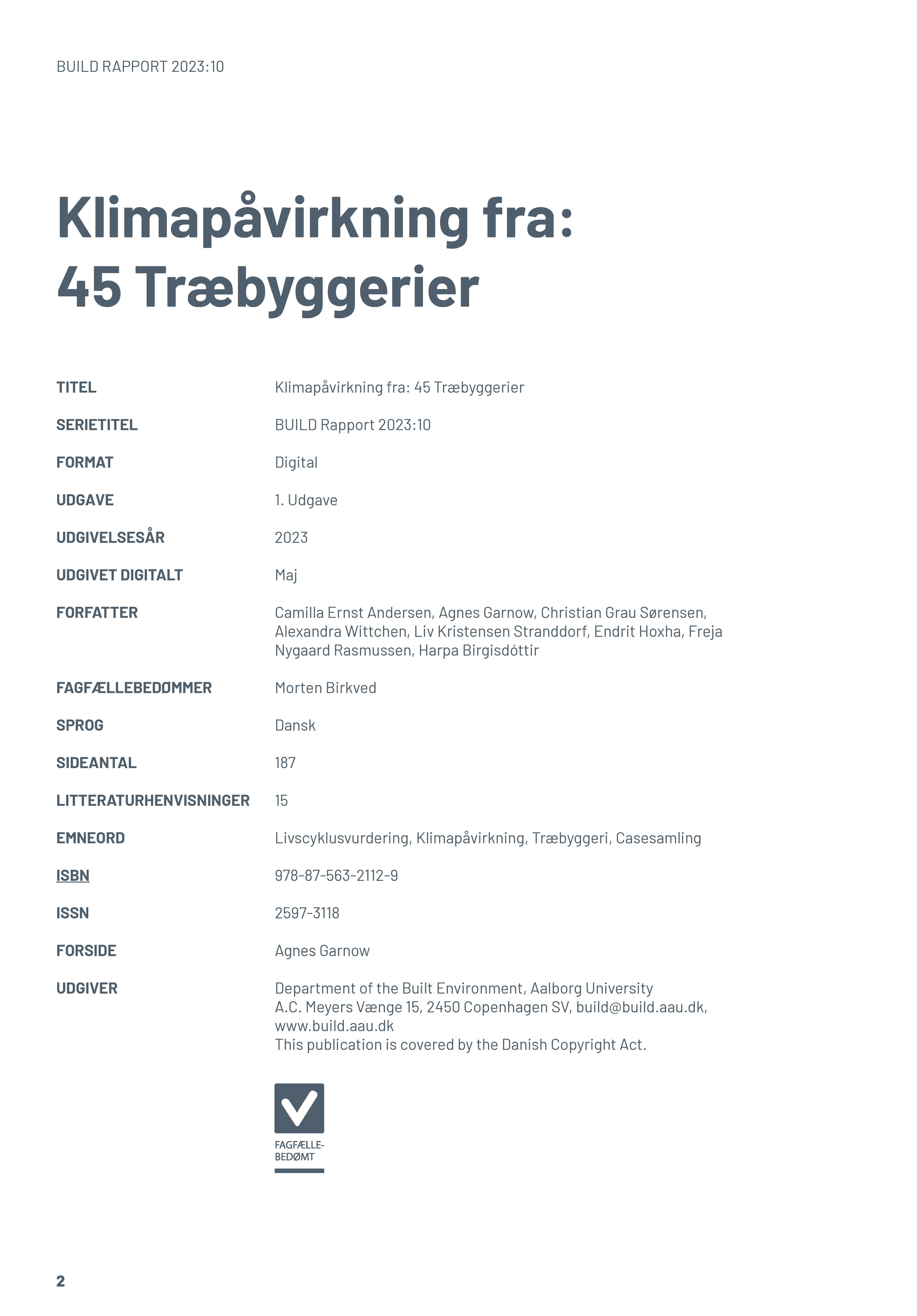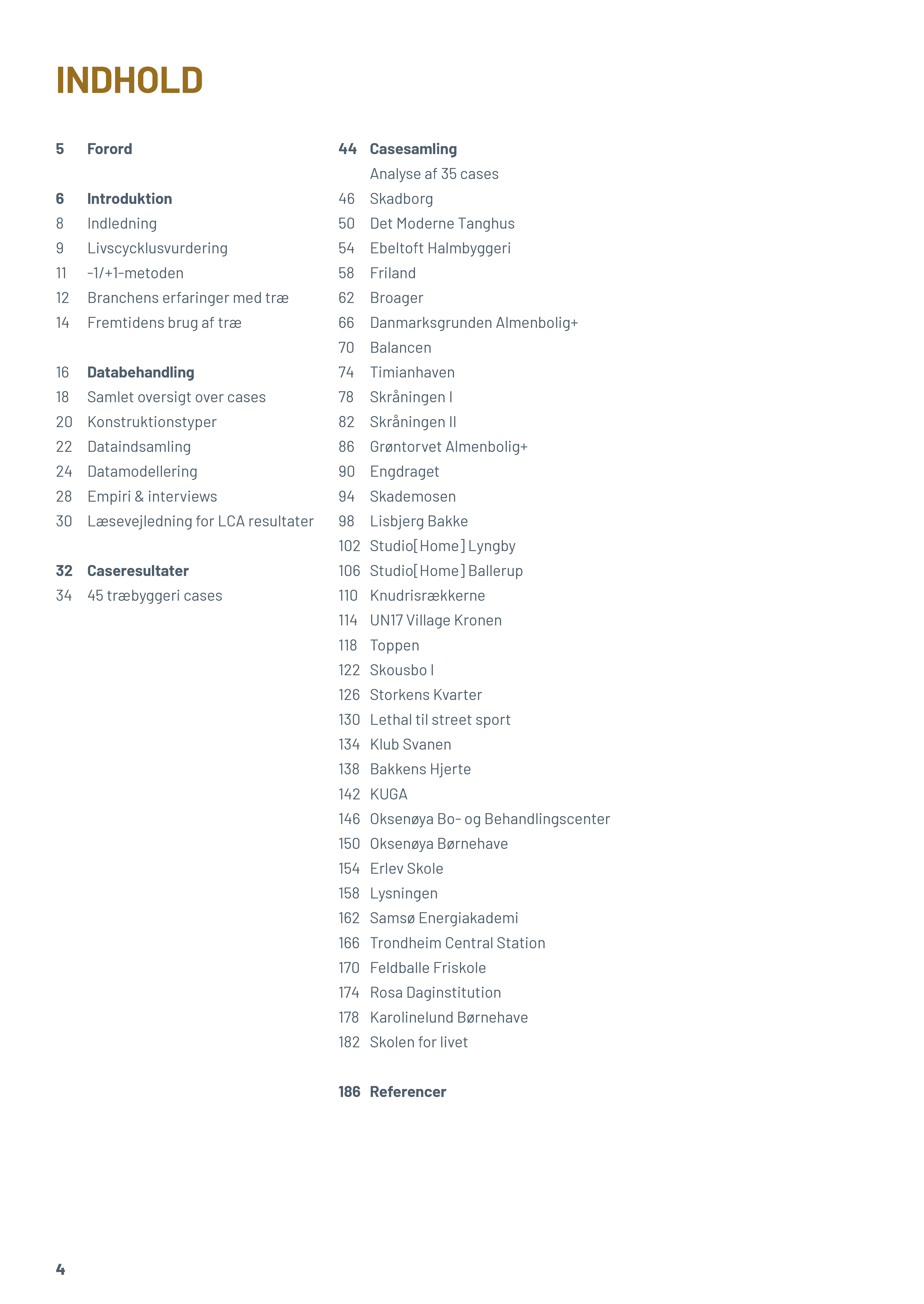 Publikationen præsenterer først en oversigt over klimapåvirkningen for 45 træbyggerier. Dernæst en casesamling af 35 træbyggerier med fokus på erfaringer med at designe og bygge med træ, og hvilke klimapåvirkninger det enkelte byggeri medfører. Casesamlingen er et opslagsværk til inspiration for dem, som ønsker at bygge med træ.