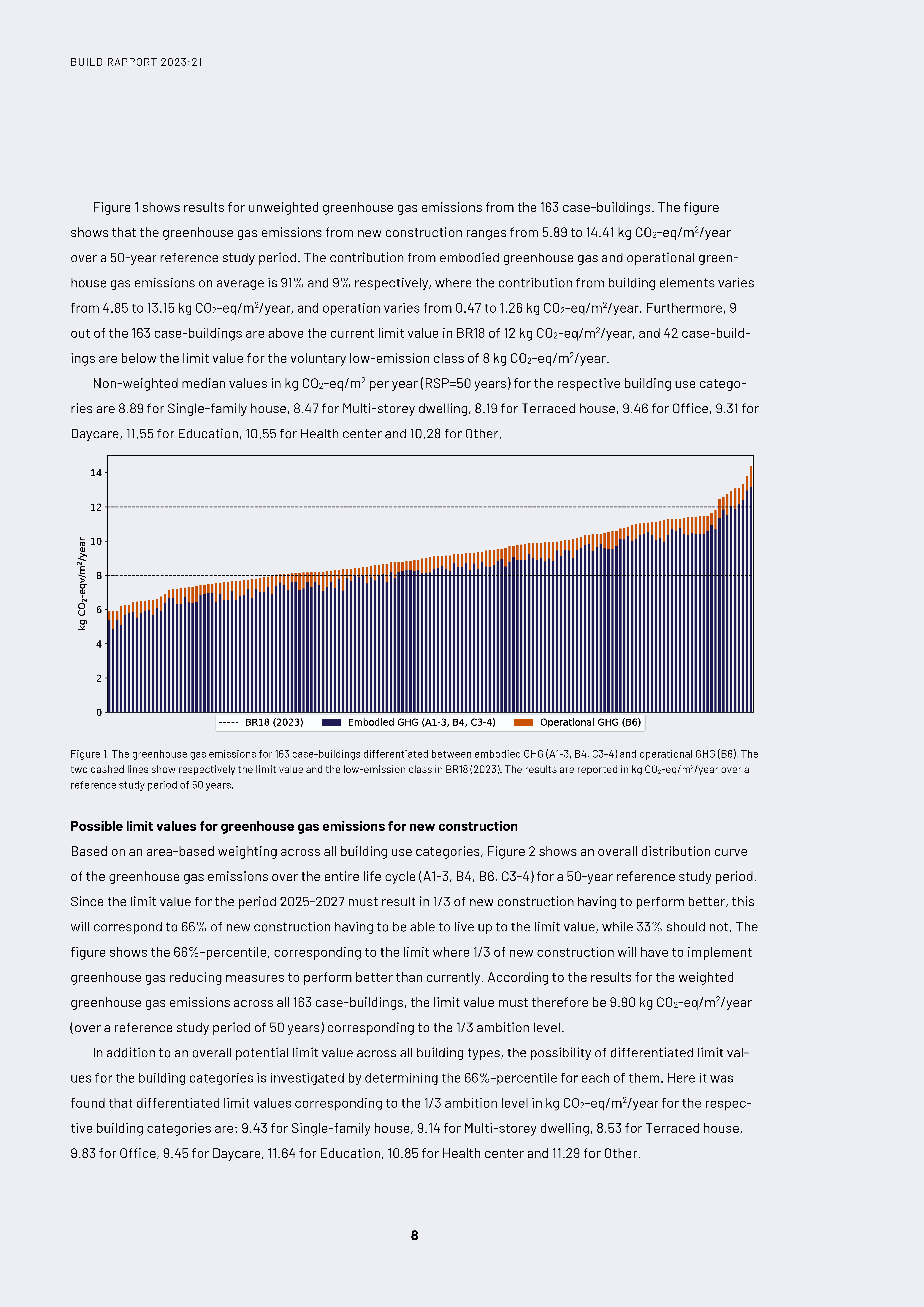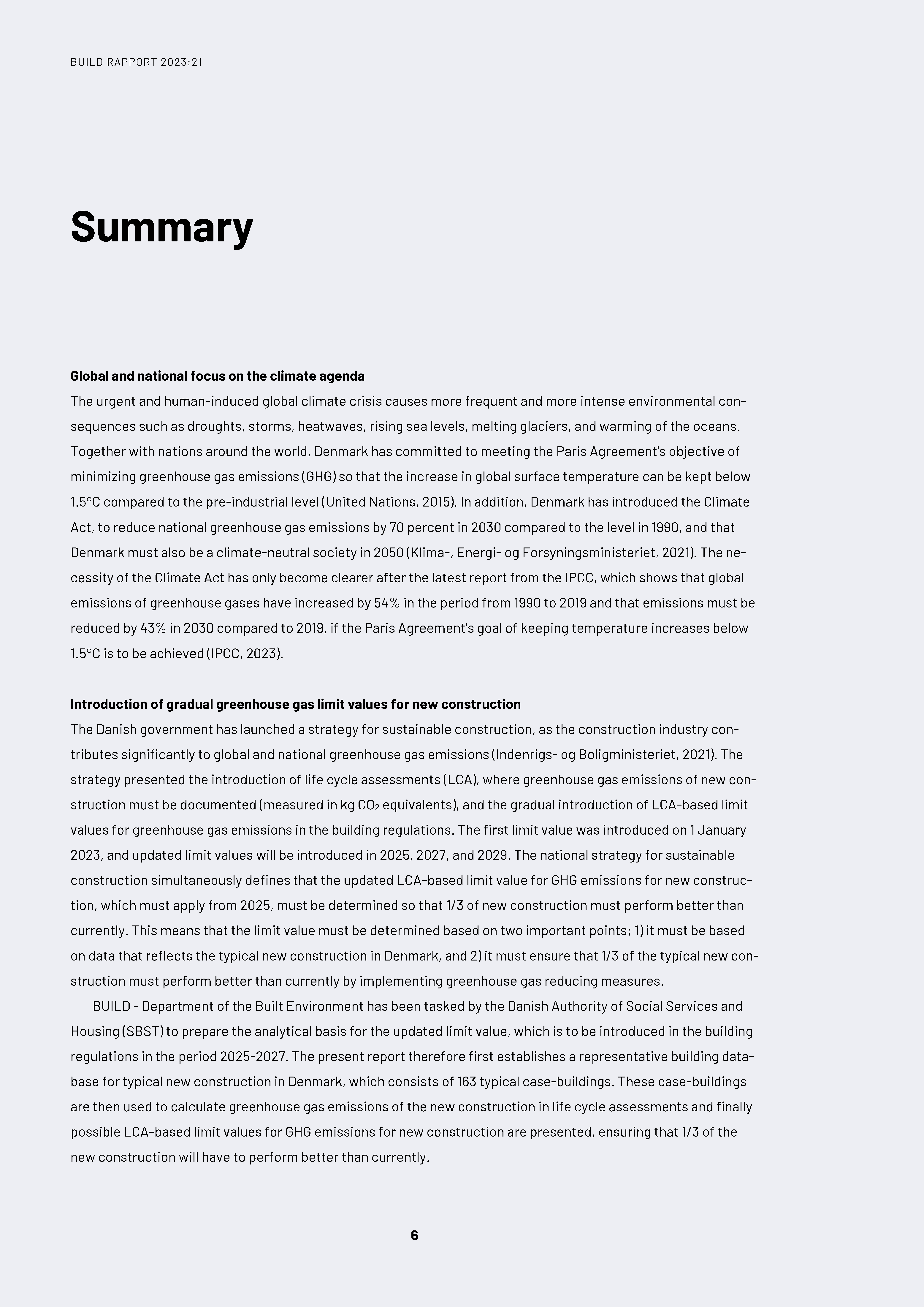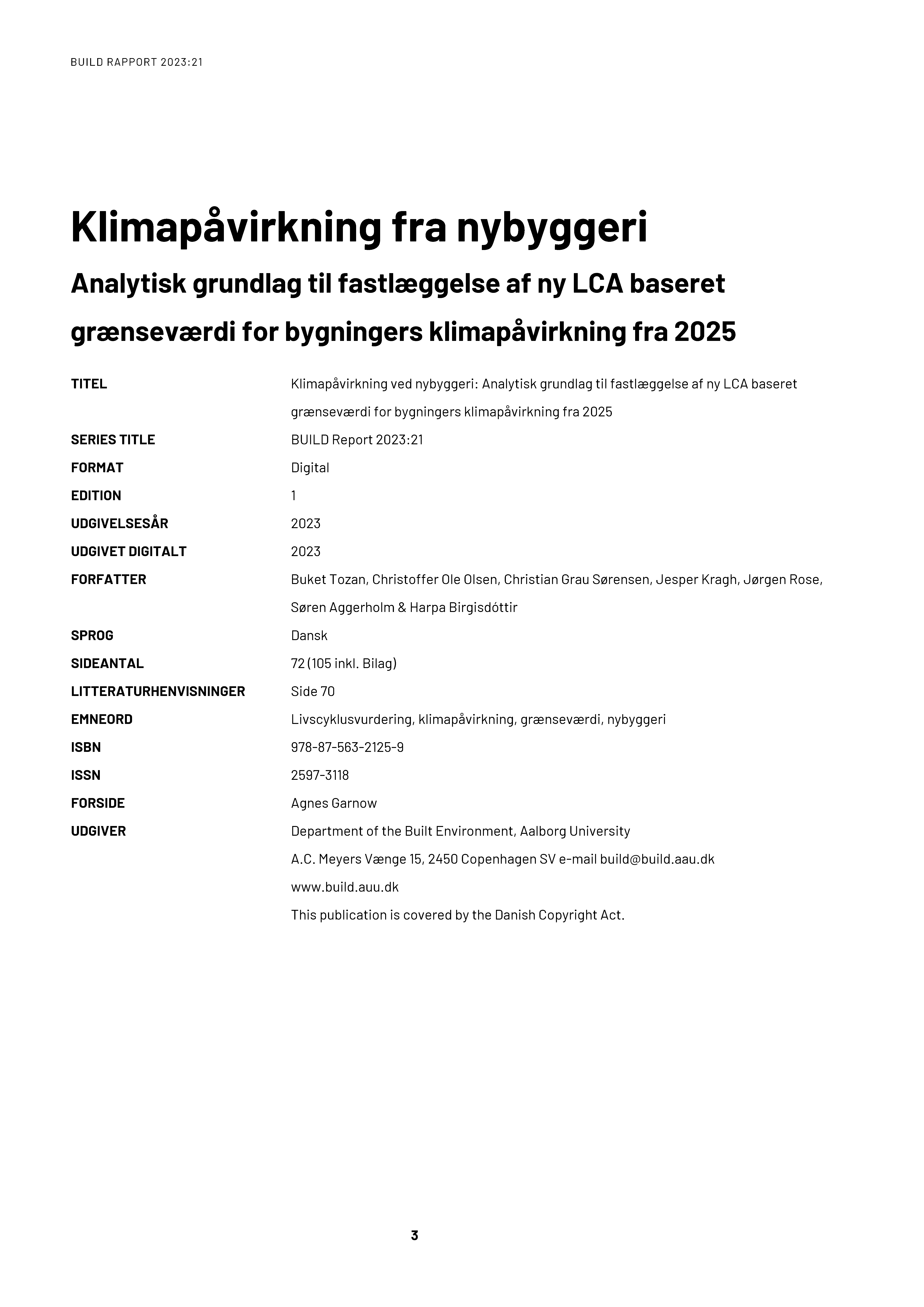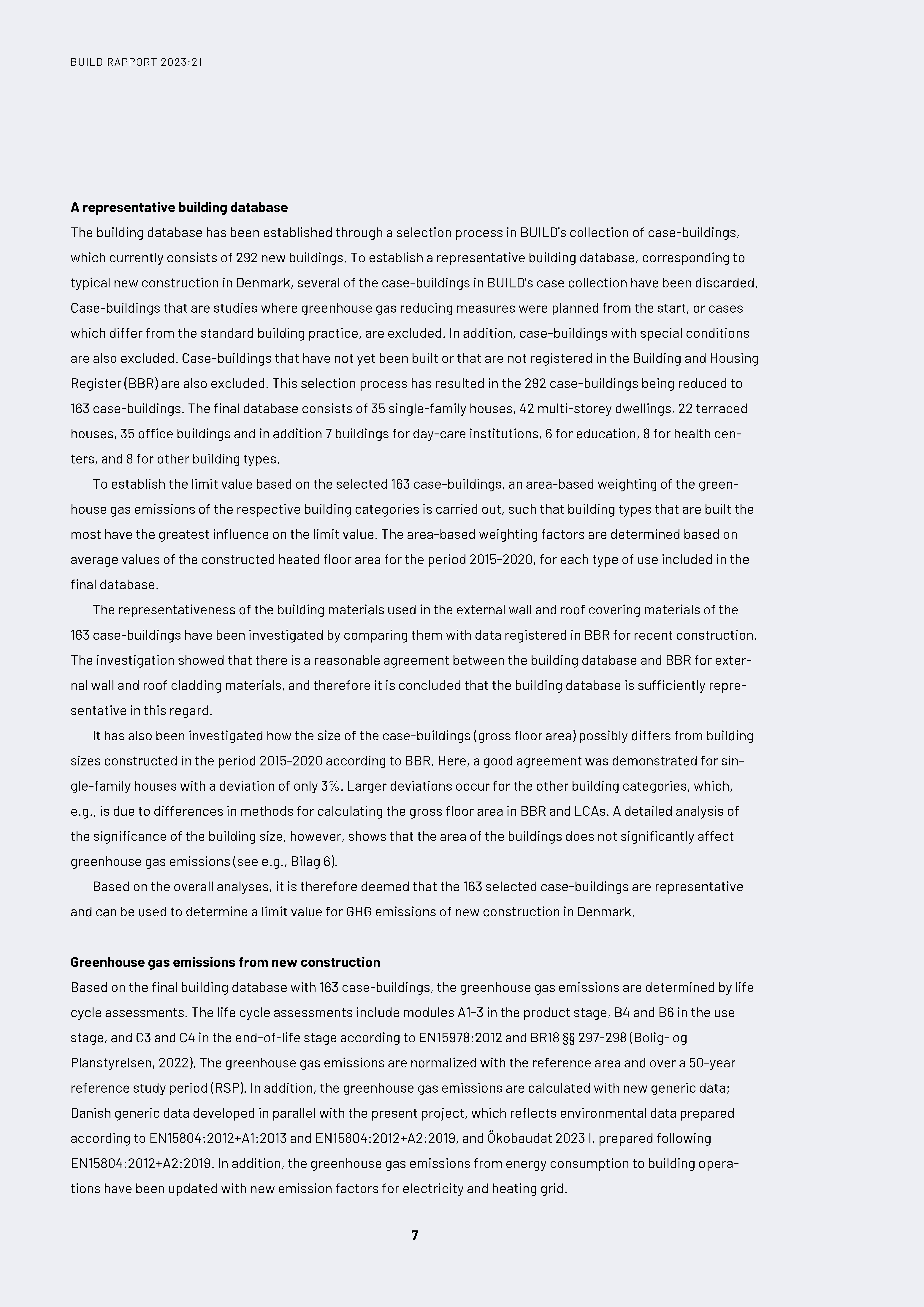 BUILD – Institut for Byggeri, By og Miljø har af Social- og Boligstyrelsen (SBST) fået til opgave at udarbejde det analytiske grundlag for den opdaterede LCA-baserede grænseværdi for klimapåvirkningen, som skal indføres i Bygningsreglementet i perioden 2025-2027. Nærværende rapport fastlægger dermed først et repræsentativt bygningsdatagrundlag for det typiske nybyggeri i Danmark, som består af 163 typiske case-bygninger. Disse casebygninger benyttes herefter til at udregne klimapåvirkninger fra nybyggeriet ved livscyklusvurderinger, og til sidst præsenteres mulige LCA-baserede grænseværdier for klimapåvirkningen, som medfører, at 1/3 af nybyggeriet vil præstere bedre end aktuelt.